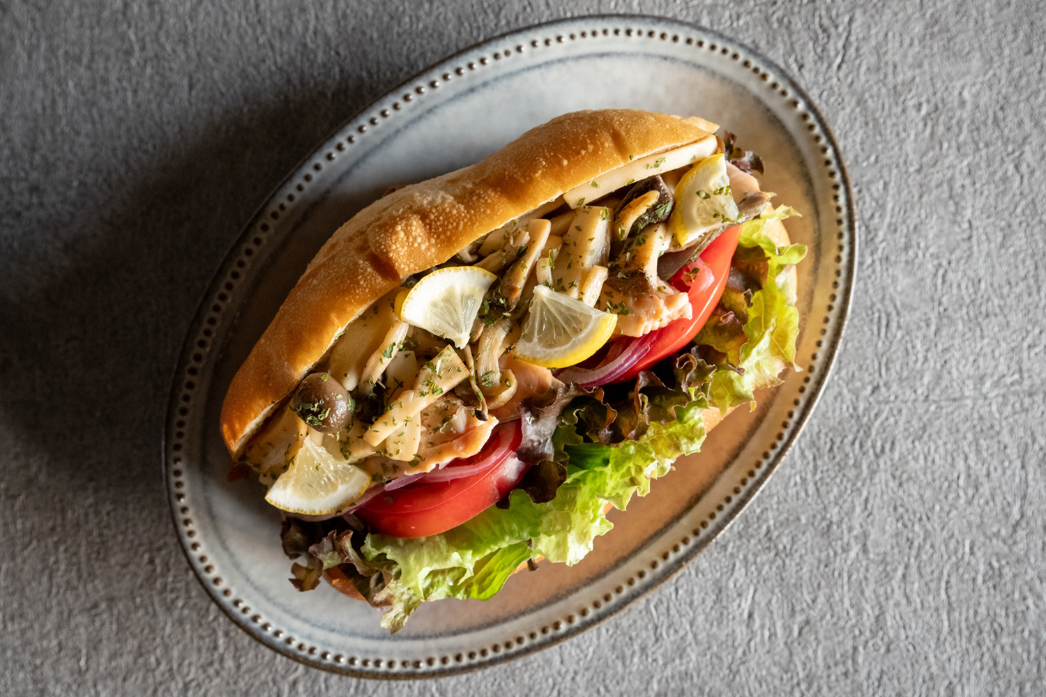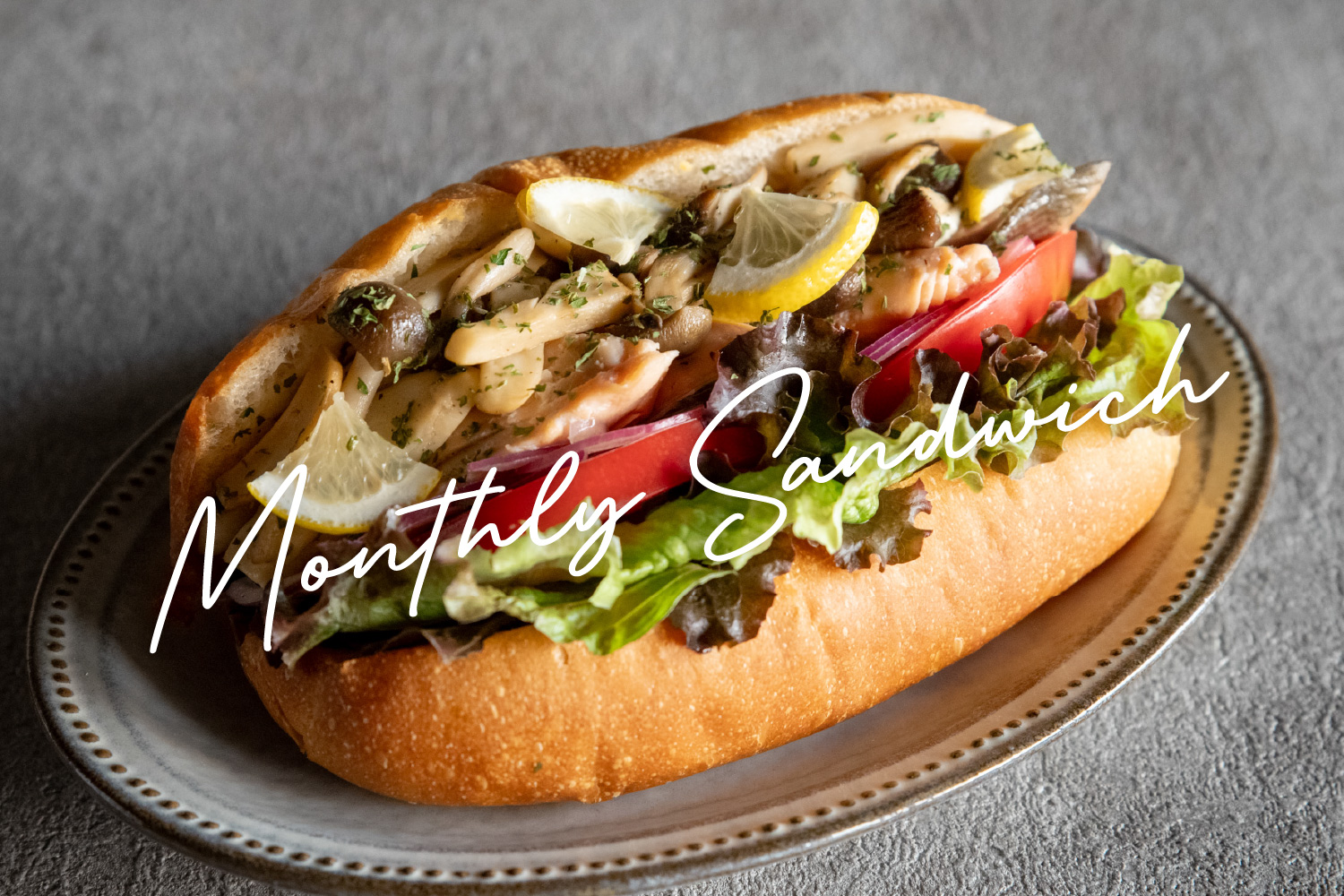 焼鮭とバター風味のきのこソテーを、タルタルソースやレモンで爽やかに仕上げた秋の味覚サンドイッチです。