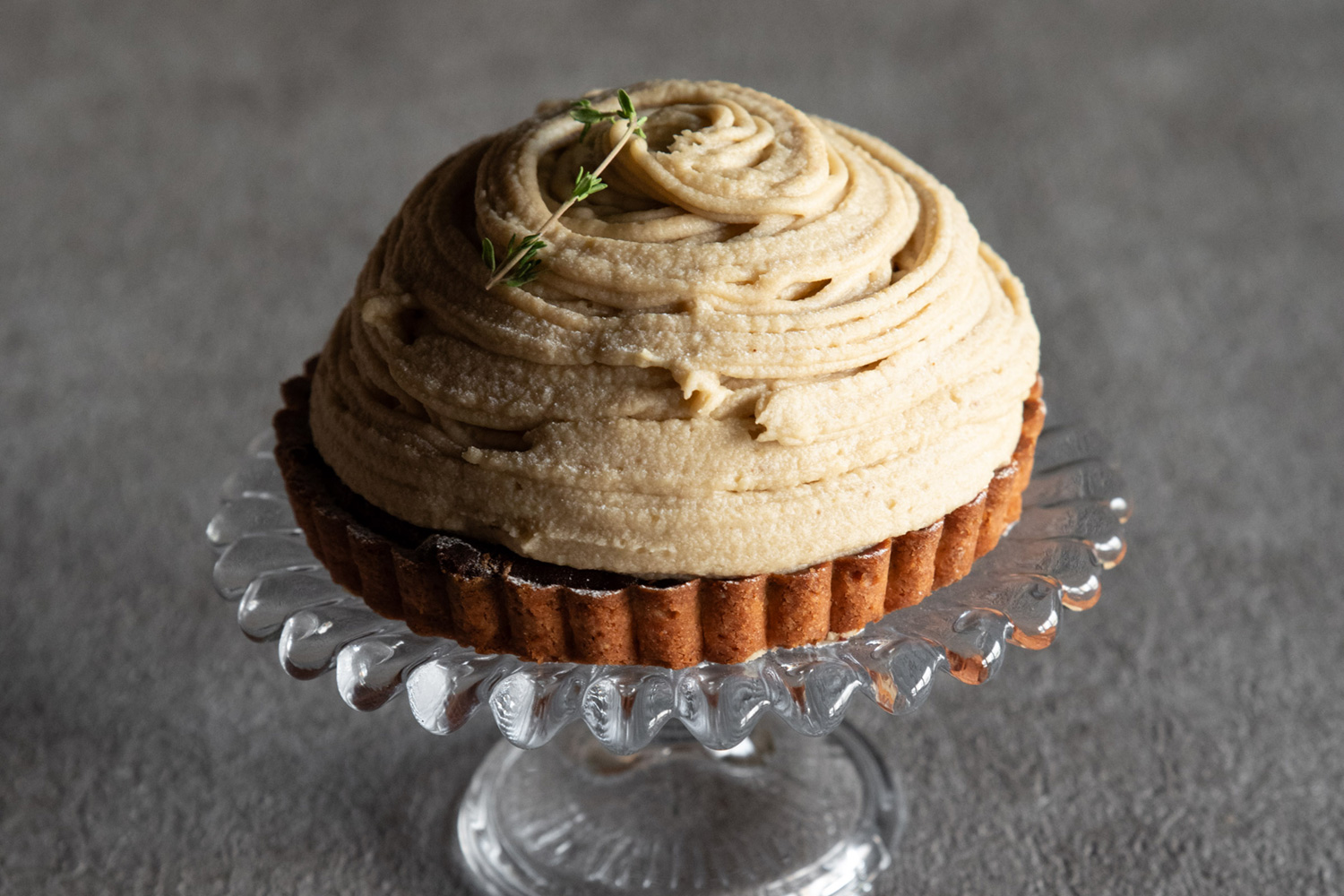 ほうじ茶香るタルトにラズベリージャムを合わせて、たっぷりの生クリームとなめらかな和栗のクリームを重ねた秋のタルト