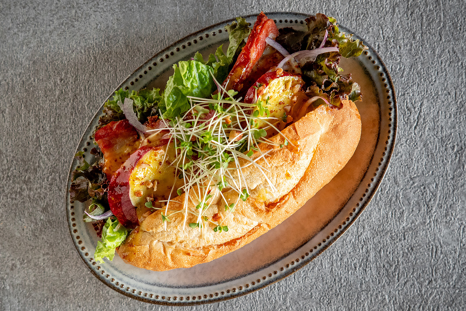 ほっくり甘いさつまいもと、香ばしく焼いた厚切りベーコンに、ハニーマスタードをトッピング。