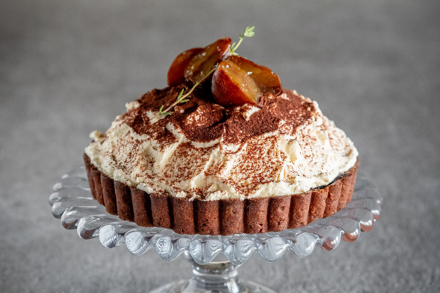 コーヒー風味のタルト台にエスプレッソを染み込ませたスポンジ、ティラミスクリームを重ね、中に栗を忍ばせた秋のティラミスタルト。