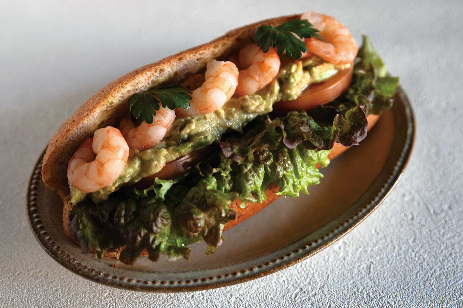 プリプリのエビとジューシーなトマトに、明太子とアボカドのタルタルソースを合わせたサンドイッチです。