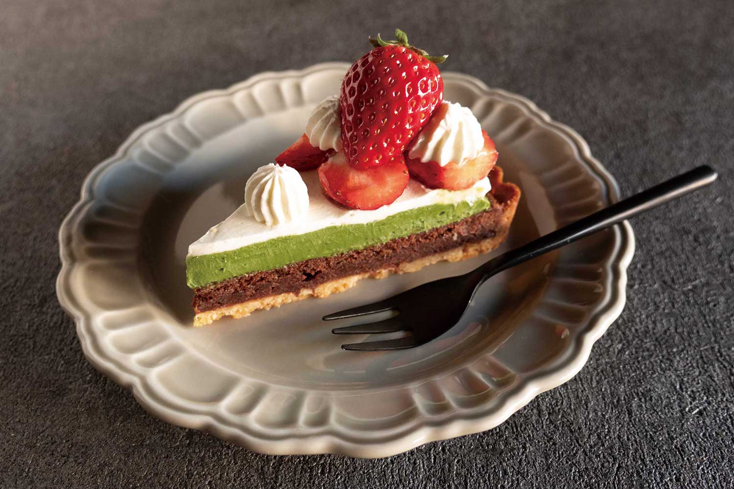しっとりチョコタルトに抹茶の生チョコを重ね、旬のいちごを飾った、彩りが美しいタルトです。