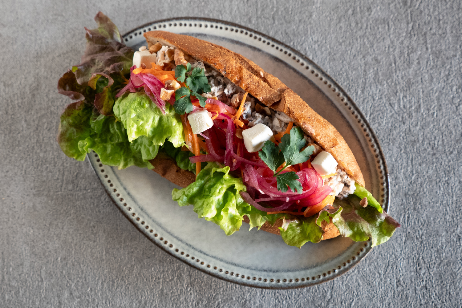 赤しそであえたしっとり蒸し鶏と、キャロットラペ・レッドオニオンラペの爽やかな酸味。さっぱりとした味わいで、食べ応えも抜群のサンドイッチです。