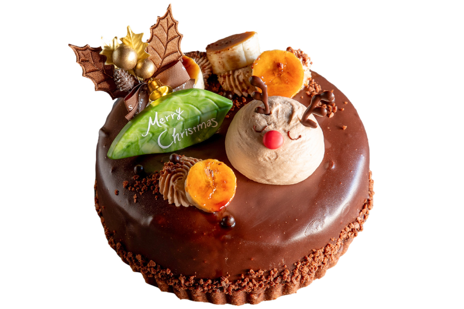 - チョコチップ入りのサクサクタルトに濃縮バナナムースが入った濃厚チョコムース。ひょっこりトナカイが可愛いチョコバナナタルト。